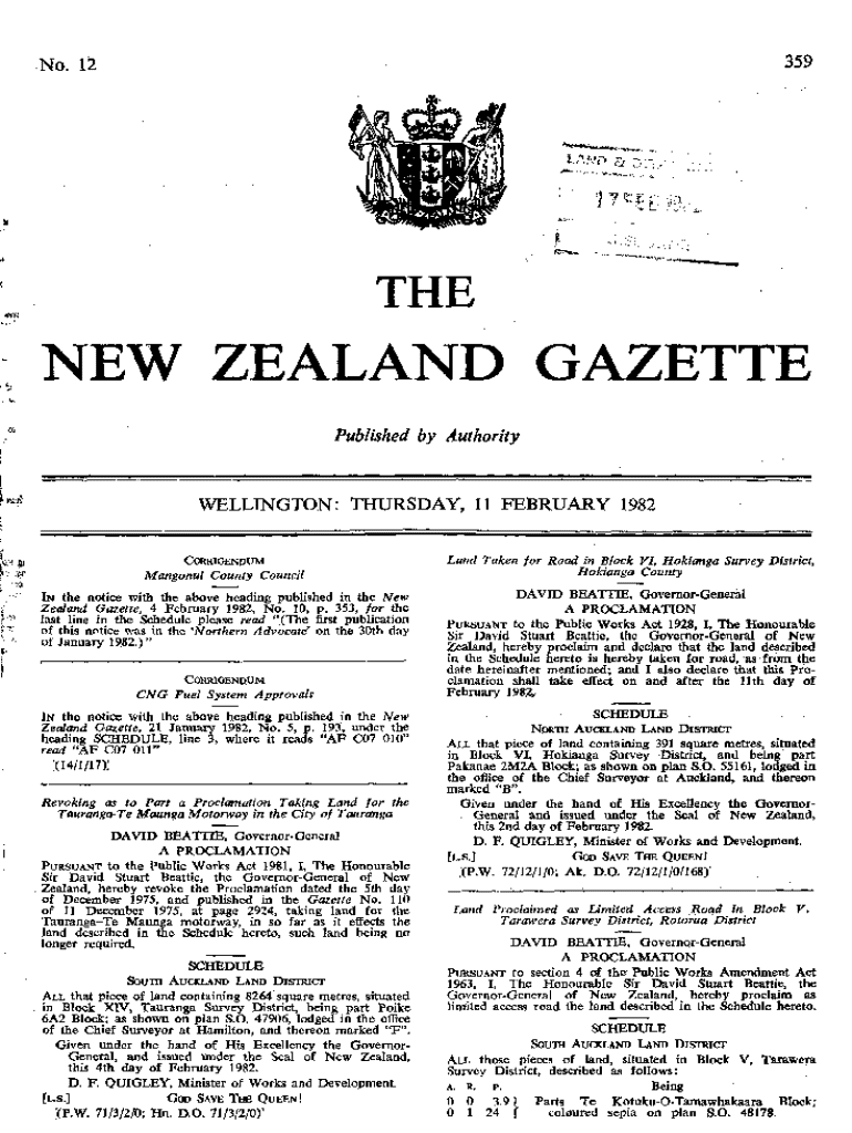 35 9No. 12THE NEW ZEALAND GAZETTE Published by AuthorityWELLINGTON : THURSDAY, 11 FEBRUARY 1982 CORRIGENDUMLand Taken for Road in Block VI, Hoking Survey District, Hoking County IN the notice with