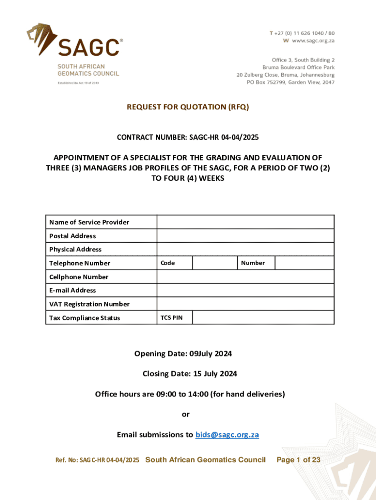 REQUEST FOR QUOTATION (RFQ)CONTRACT NUMBER: SAG CHR 0404/2025 APPOINTMENT OF A SPECIALIST FOR THE GRADING AND EVALUATION OF THREE (3) MANAGERS JOB PROFILES OF THE SAGA, FOR A PERIOD OF TWO (2) TO