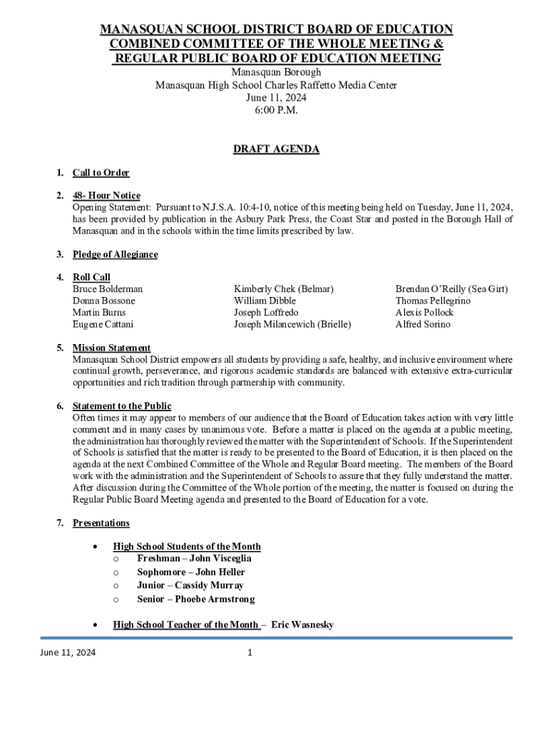 MANASQUAN SCHOOL DISTRICT BOARD OF EDUCATION COMBINED COMMITTEE OF THE WHOLE MEETING & REGULAR PUBLIC BOARD OF EDUCATION MEETING Manasquan Borough Manasquan High School Charles Raffetto Media Center