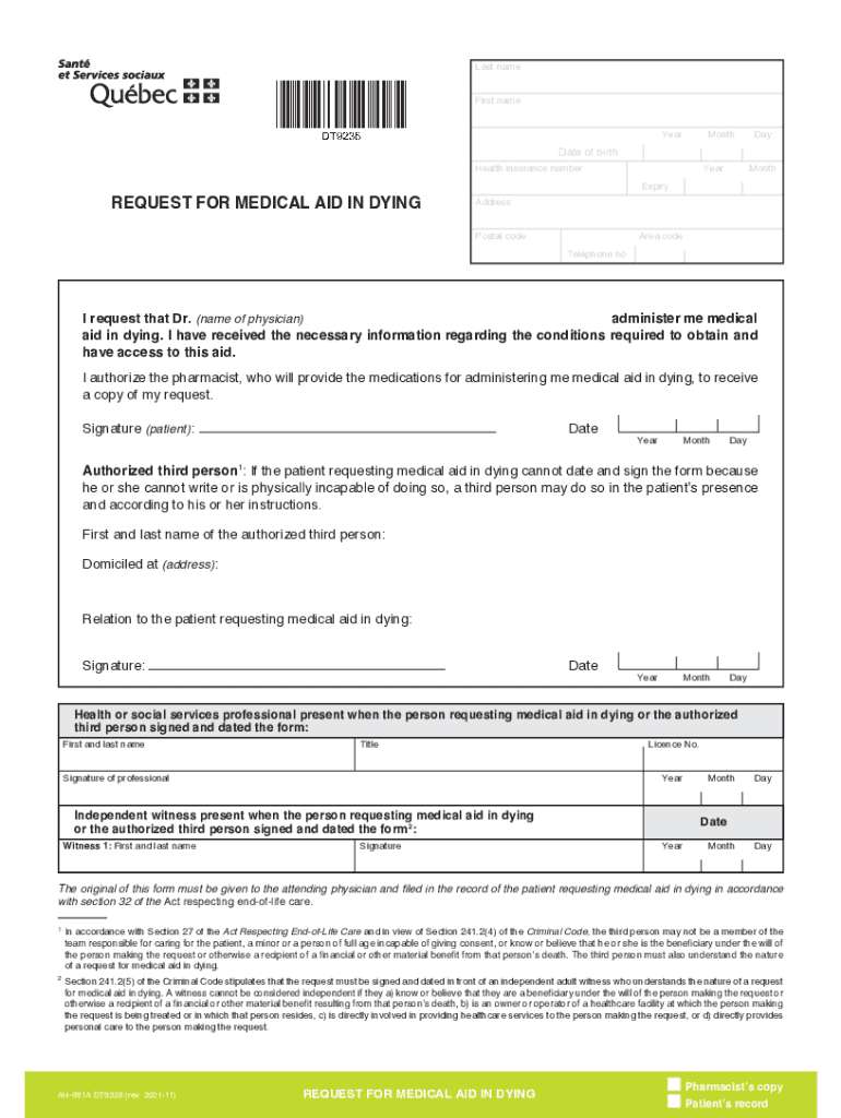 First nameYearMonthDayDate of birthHealth insurance numberREQUEST FOR MEDICAL AID IN DYINGYearMonthExpiryAddress