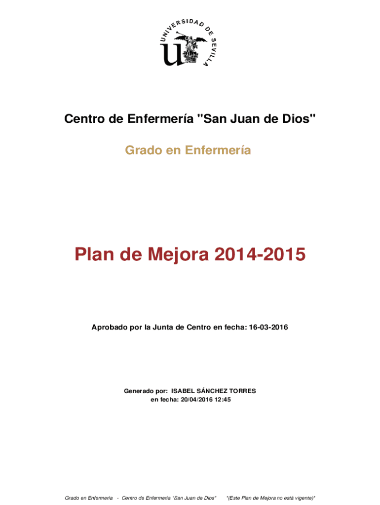 Centro de Enfermera \"San Juan de Dios\" Grado en EnfermeraPlan de Mejora 20142015Aprobado por la Junta de Centro en fecha: 16032016Generado por: ISABEL SNCHEZ TORRES en fecha: 20/04/2016 12:45Grado