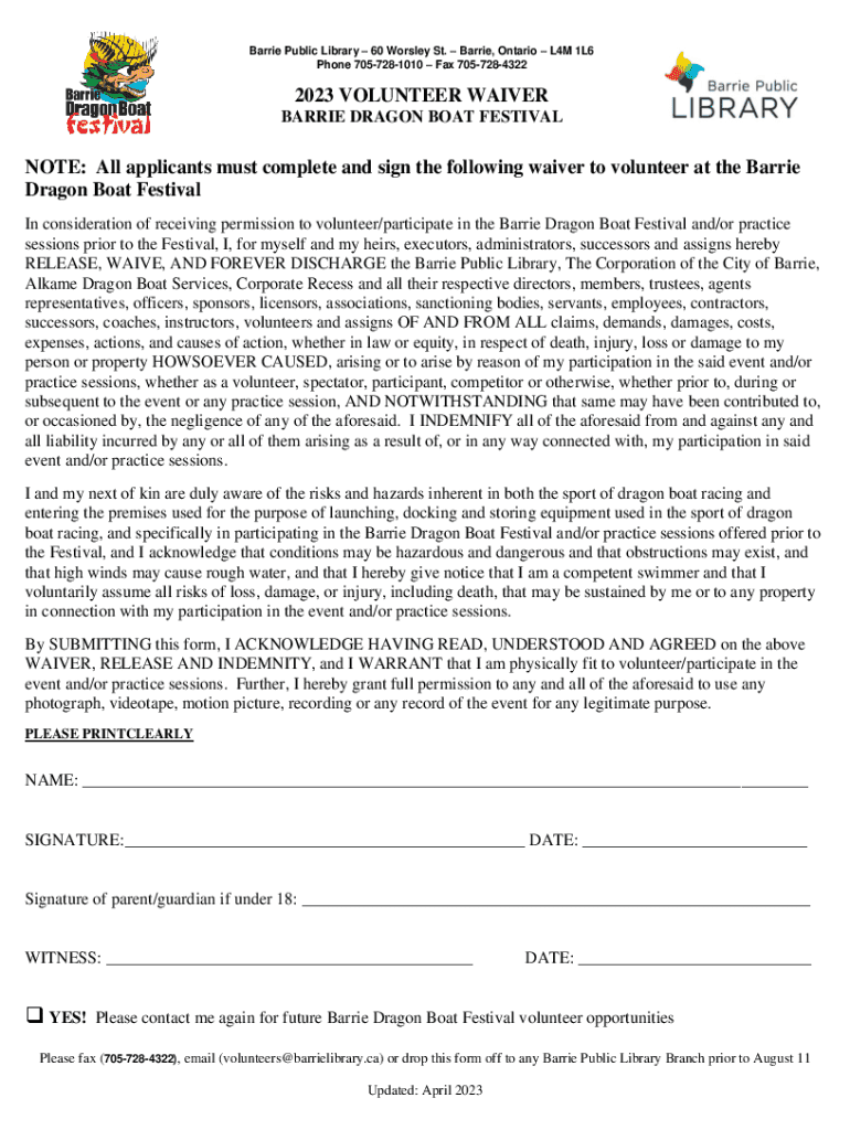 Barrie Public Library 60 Worsley St. Barrie, Ontario L4M 1L6 Phone 7057281010 Fax 70572843222023 VOLUNTEER WAIVER BARRIE DRAGON BOAT FESTIVALNOTE: All applicants must complete and sign the following
