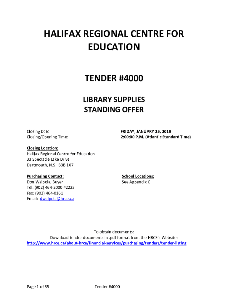 HALIFAX REGIONAL Center FOR EDUCATION TENDER #4000 LIBRARY SUPPLIES STANDING OFFER FRIDAY, JANUARY 25, 2019 2:00:00 P.M. (Atlantic Standard Time)Closing Date: Closing/Opening Time: Closing Location: