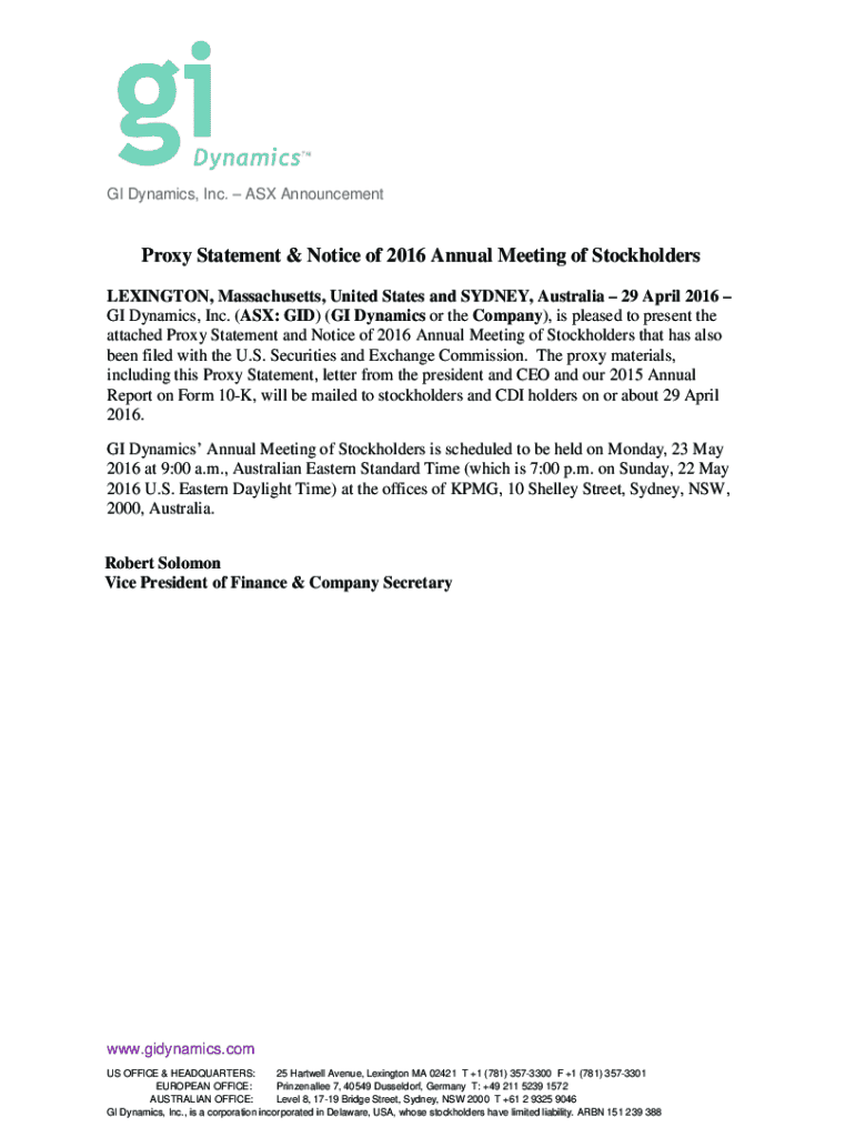 GI Dynamics, Inc. ASX AnnouncementProxy Statement & Notice of 2016 Annual Meeting of Stockholders LEXINGTON, Massachusetts, United States and SYDNEY, Australia 29 April 2016 GI Dynamics, Inc. (ASX: