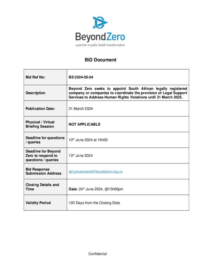 BiD DocumentBid Ref No:BZ20240504DescriptionBeyond Zero seeks to appoint South African legally registered company or companies to coordinate the provision of Legal Support Services to Address Human