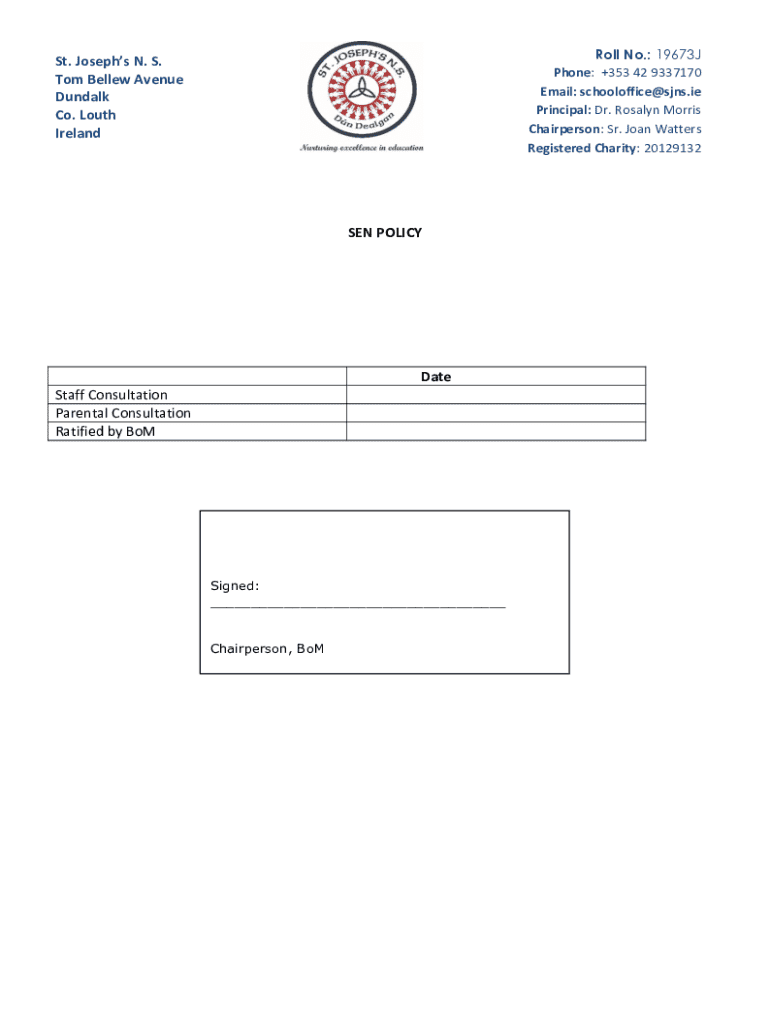 The school administration or authorized personnel are required to file St Joseph's N.S.