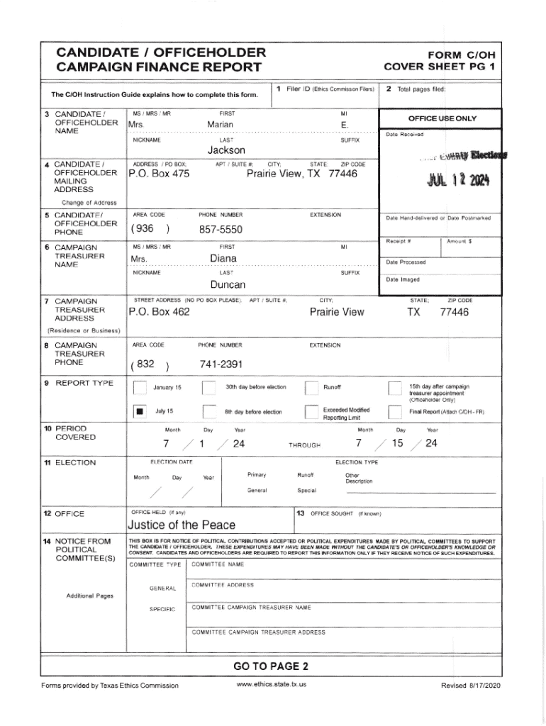 CANDIDATE / OFFICEHOLDER CAMPAIGN FINANCE REPORT Tho C/OH lnstruction Guide explains how to complelo this lo.m3FORM C/OH COVER SHEET PG 1 1 Filer lO(Ethi6 Cmmissio. Fil66)2Tolal pages fil6d:CANDIDATE