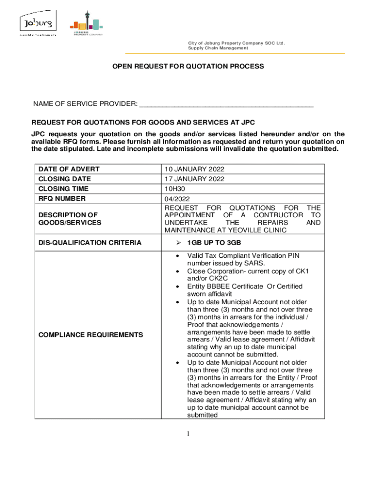 Supply Chain ManagementOPEN REQUEST FOR QUOTATION PROCESSABLE OF SERVICE PROVIDER: ___