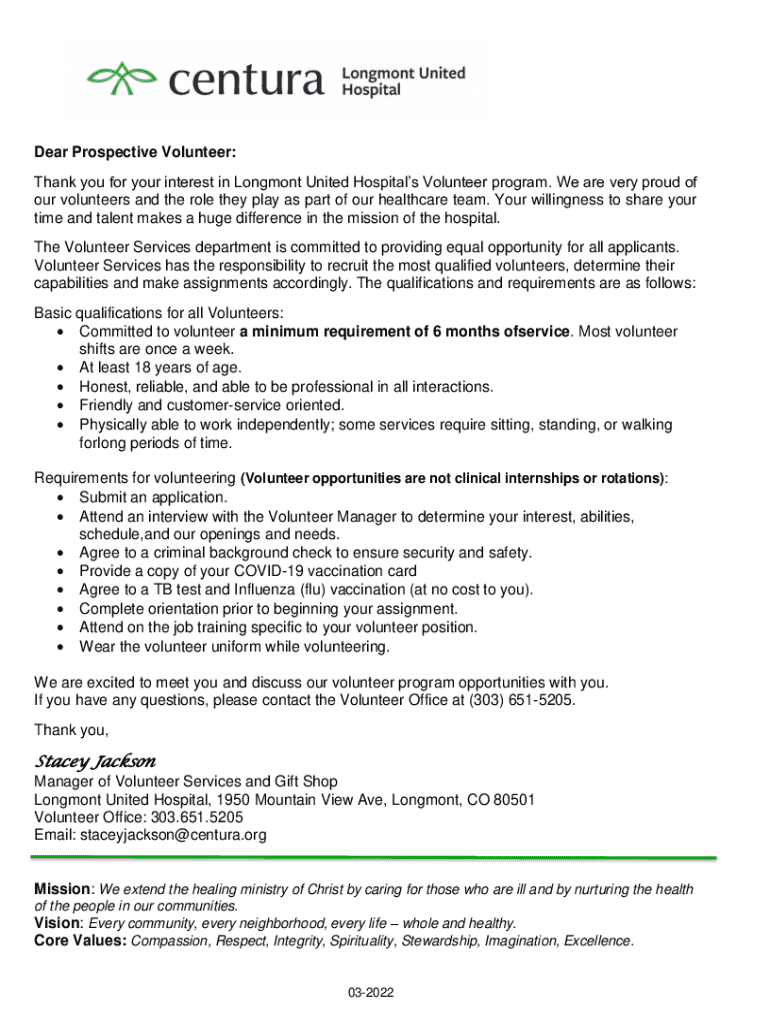 Dear Prospective Volunteer: Thank you for your interest in Longmont United Hospitals Volunteer program. We are very proud of our volunteers and the role they play as part of our healthcare team. Your
