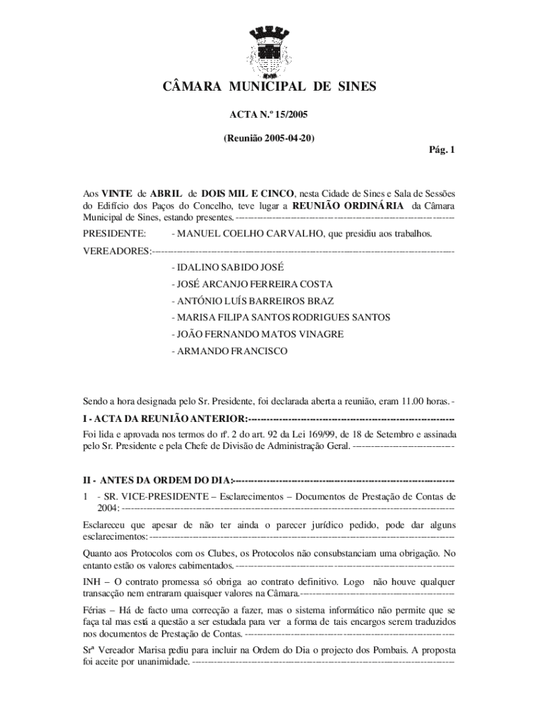 Obtenha o gratuito Aos VINTE de ABRIL de DOIS MIL E CINCO, nesta Cidade de Sines e Sala de Sesses