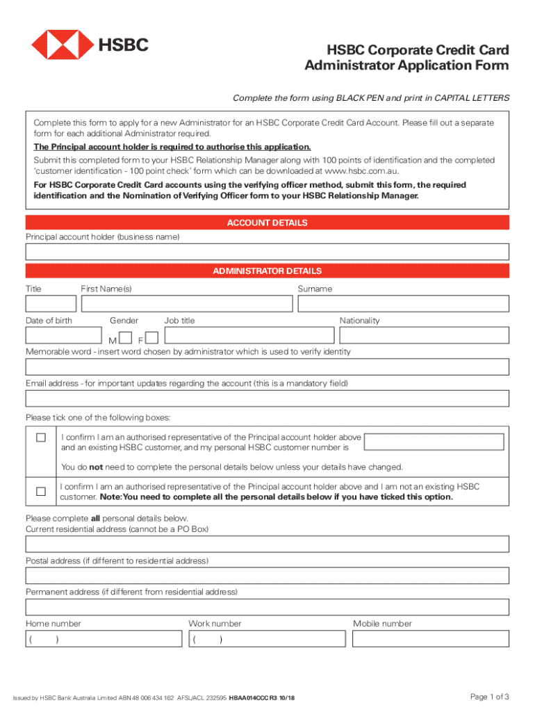 HSBC Corporate Credit Card Administrator Application Form Complete the form using BLACK PEN and print in CAPITAL LETTERS Complete this form to apply for a new Administrator for an HSBC Corporate Credit