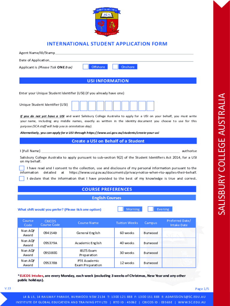 INTERNATIONAL STUDENT APPLICATION FORM Agent Name/ID/Stamp Date of Application Applicant is (Please Tick ONE Box)OffshoreOnshoreEnter your Unique Student Identifier (USI) (if you already have one)