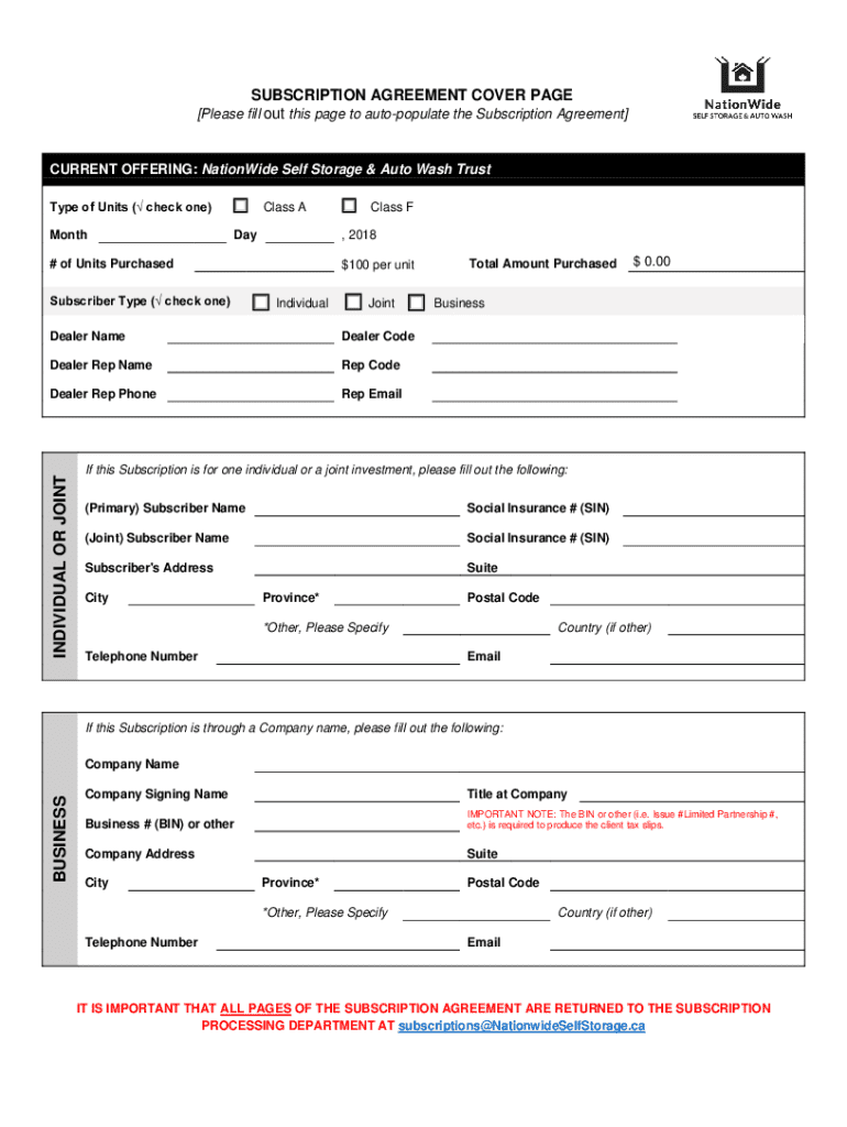 [Please fill out this page to autopopulate the Subscription Agreement]CURRENT OFFERING: Nationwide Self Storage & Auto Wash Trust