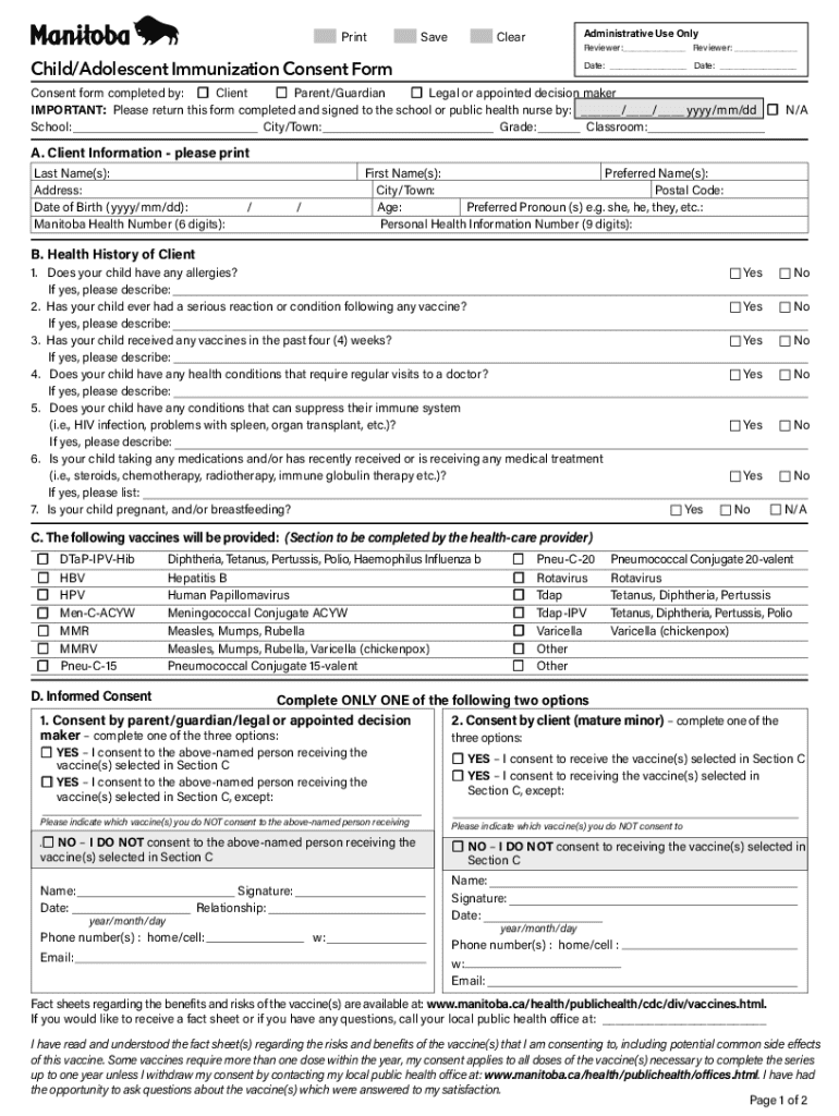 PrintSaveAdministrative Use OnlyClearReviewer:___ Reviewer: ___Child/Adolescent Immunization Consent Format: ___ Date: ___Consent form completed by: Client