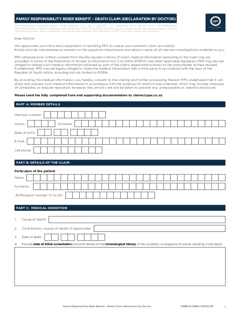 FAMILY RESPONSIBILITY RIDER BENEFIT DEATH CLAIM (DECLARATION BY DOCTOR) The Professional Provident Society (PPS) Holdings Trust No IT 312/2011 is a registered South African Trust. The Professional
