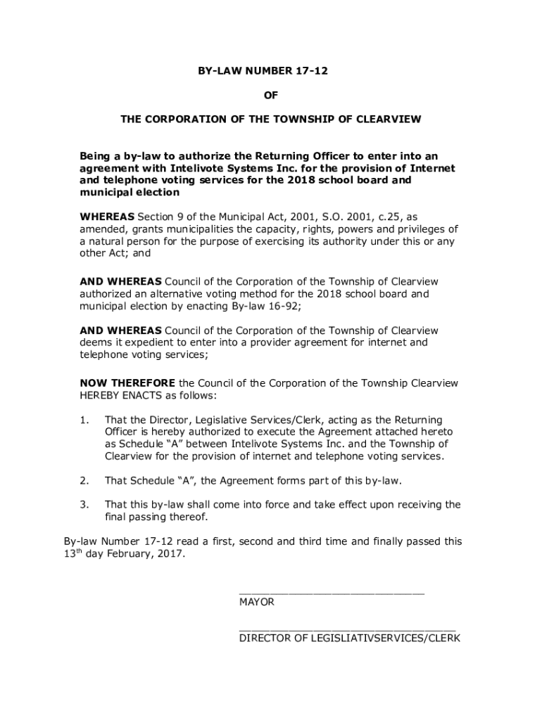 BYLAW NUMBER 1712 OF THE CORPORATION OF THE TOWNSHIP OF CLEARVIEW Being a bylaw to authorize the Returning Officer to enter into an agreement with Indelicate Systems Inc. for the provision of Internet