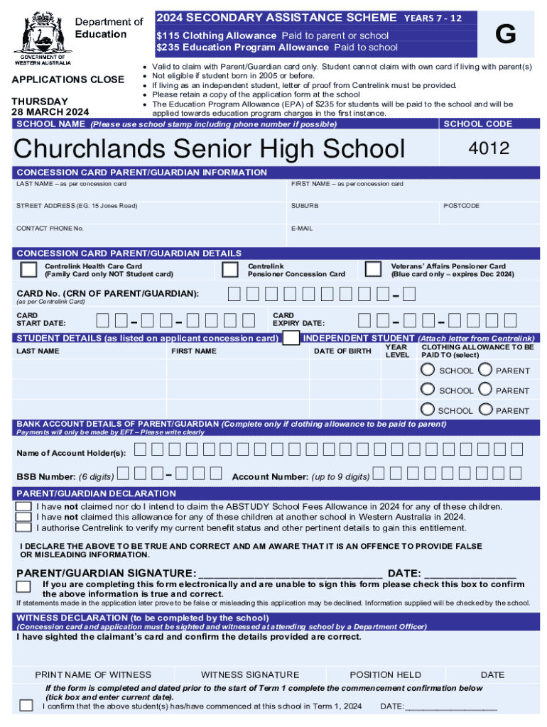 2024SECONDARY ASSISTANCE SCHEME PUBLIC SCHOOLS Applications close 28 March 2024GENERAL INFORMATION The State Government through the Western Australian Department of Education provides an allowance