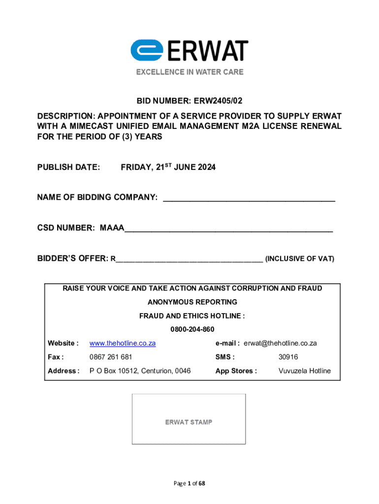BID NUMBER: ERW2405/02 DESCRIPTION: APPOINTMENT OF A SERVICE PROVIDER TO SUPPLY ERWAT WITH A MIMECAST UNIFIED EMAIL MANAGEMENT M2A LICENSE RENEWAL FOR THE PERIOD OF (3) YEARSPUBLISH DATE:FRIDAY, 21ST