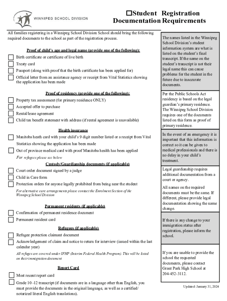 Student Registration Documentation Requirements All families registering in a Winnipeg School Division School should bring the following required documents to the school as part of the registration