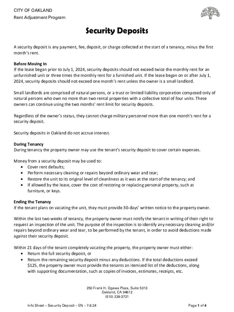 CITY OF OAKLAND Rent Adjustment ProgramSecurity Deposits A security deposit is any payment, fee, deposit, or charge collected at the start of a tenancy, minus the first months rent. Before Moving