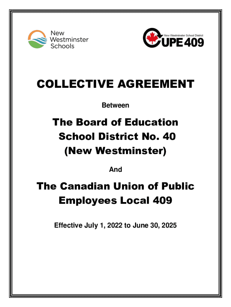 COLLECTIVE AGREEMENT BetweenThe Board of Education School District No. 40 (New Westminster) AndThe Canadian Union of Public Employees Local 409 Effective July 1, 2022 to June 30, 2025TABLE OF CONTENTS