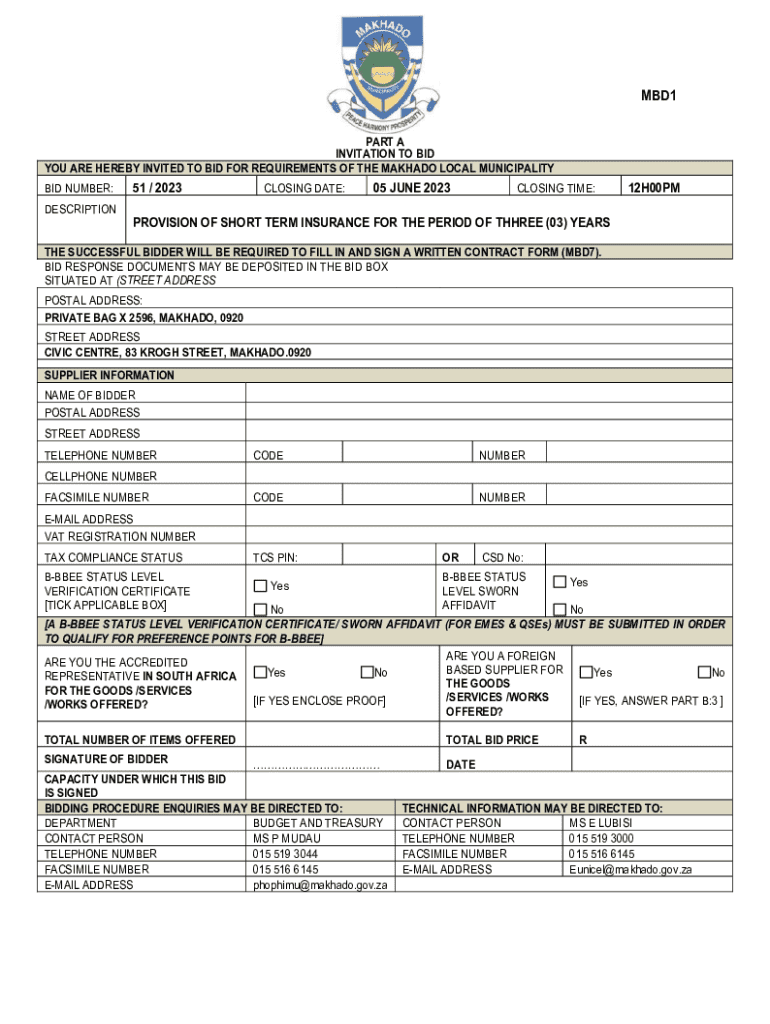 MBD1 PART A INVITATION TO BID YOU ARE HEREBY INVITED TO BID FOR REQUIREMENTS OF THE MAKHADO LOCAL MUNICIPALITY BID NUMBER: DESCRIPTION51 / 2023CLOSING DATE:05 JUNE 2023CLOSING TIME:12H00PMPROVISION