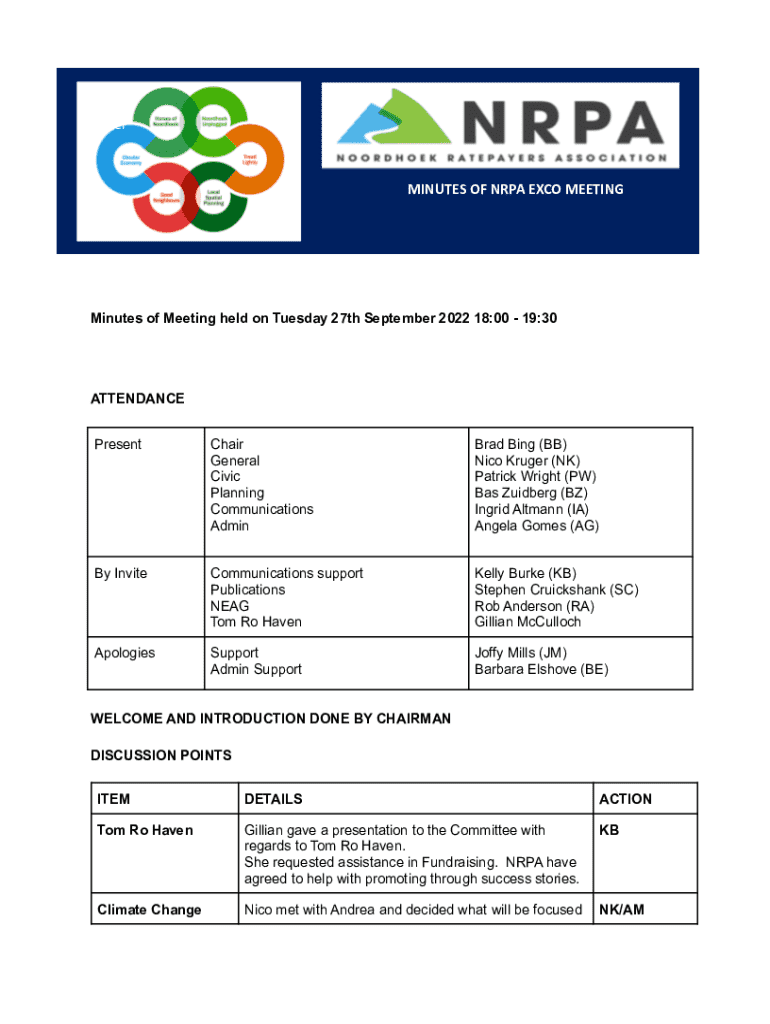 Le eMINUTES OF NRPA E CO MEETINGDDDD Minutes of Meeting held on Tuesda 27th September 2022 18:00 19:30ATTENDANCE P e enChai Gene al Ci ic Planning Comm nica ion AdminB In i eComm nica ion P blica