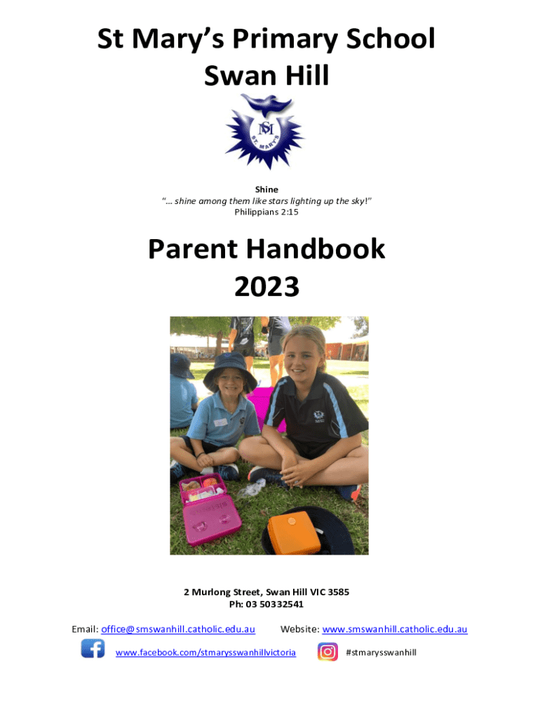 St Mary's Primary School Swan Hillside shine among them like stars lighting up the sky! Philippians 2:15Parent Handbook 20232 Furlong Street, Swan Hill VIC 3585 pH: 03 50332541 Email: office@smswanhill.catholic.edu.auWebsite: