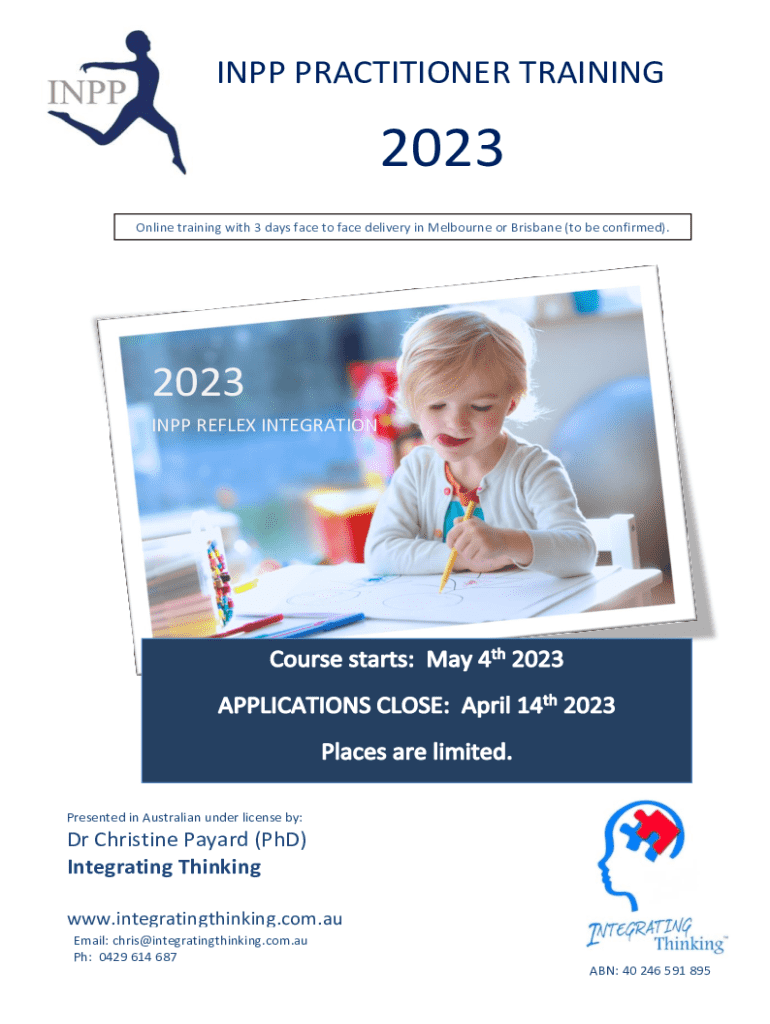 INPP PRACTITIONER TRAINING2023 Online training with 3 days face to face delivery in Melbourne or Brisbane (to be confirmed).2023 INPP REFLEX INTEGRATIONPresented in Australian under license by:Dr
