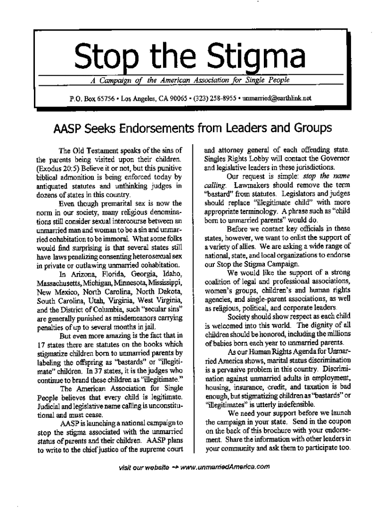 Stop the Stigma A Campaign of the American Association for Single People P.O. Box 65756 Los Angeles, CA 90065 (323) 2588955 uimiarried@earthlink.netAASP Seeks Endorsements from Leaders and Groups