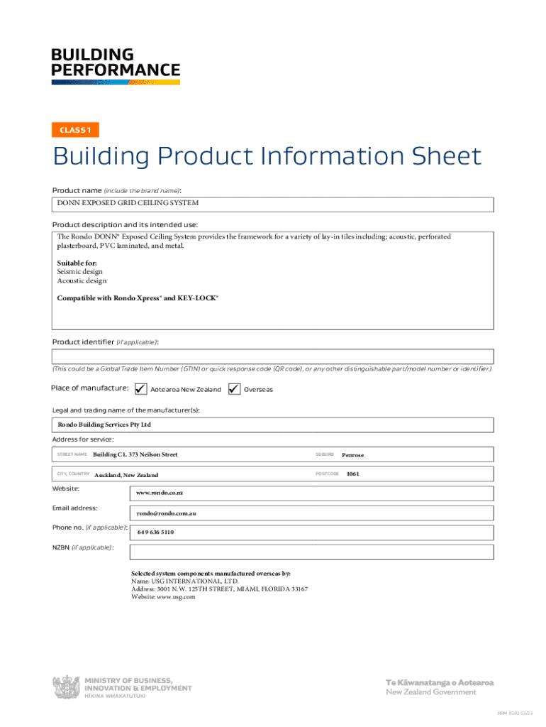 CLASS 1Building Product Information Sheet Product name (include the brand name): DONN EXPOSED GRID CEILING SYSTEM Product description and its intended use: The Rondo DONN Exposed Ceiling System provides