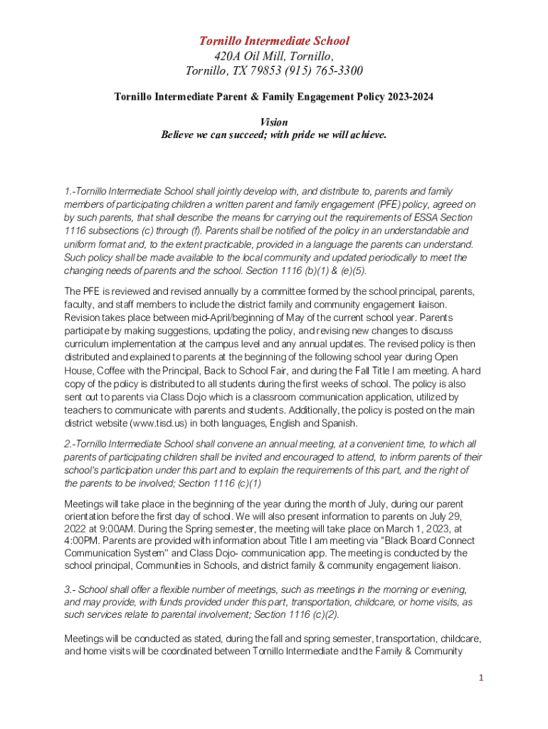 Tornillo Intermediate School 420A Oil Mill, Tornillo, Tornillo, TX 79853 (915) 7653300 Tornillo Intermediate Parent & Family Engagement Policy 20232024 Vision Believe we can succeed; with pride we