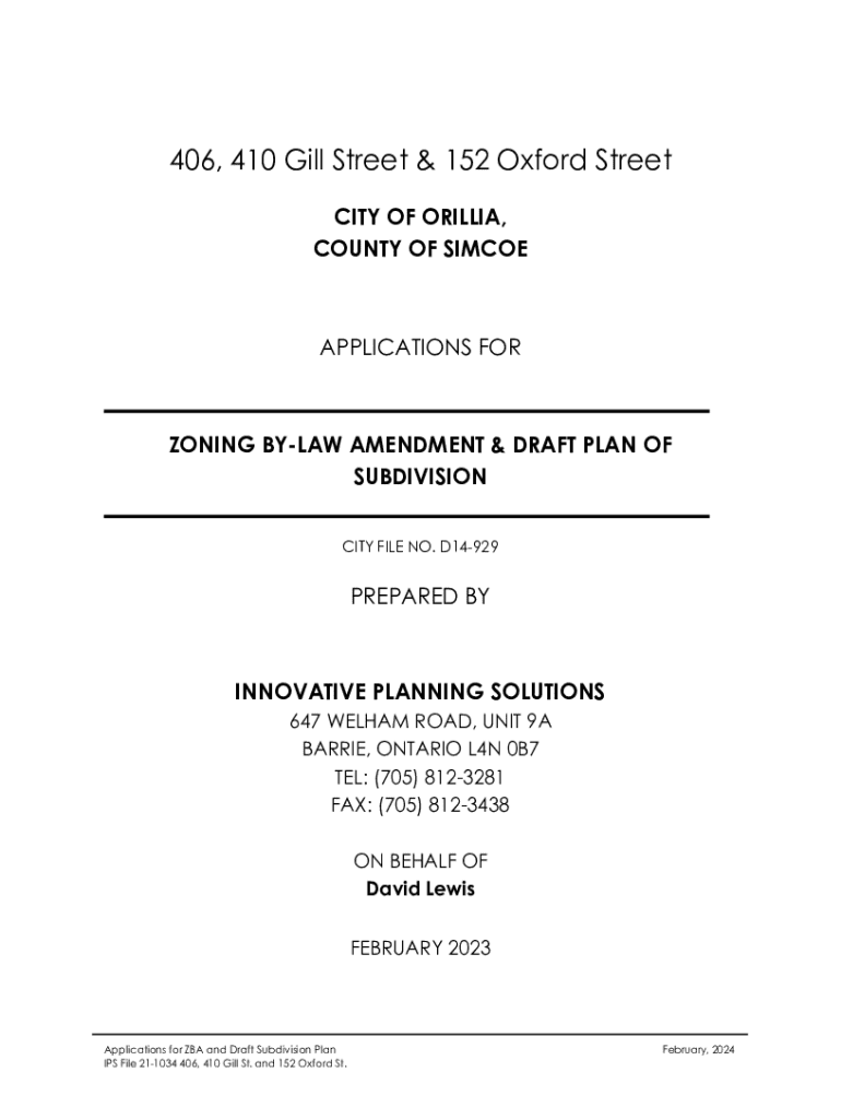 406, 410 Gill Street & 152 Oxford Street CITY OF ORILLIA, COUNTY OF SIMCOEAPPLICATIONS FORZONING BYLAW AMENDMENT & DRAFT PLAN OF SUBDIVISION CITY FILE NO. D14929PREPARED BYINNOVATIVE PLANNING SOLUTIONS