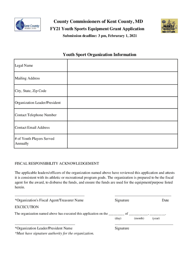 County Commissioners of Kent County, MD FY21 Youth Sports Equipment Grant Application Submission deadline: 3 pm, February 1, 2021Youth Sport Organization Information Legal Name Mailing Address City,