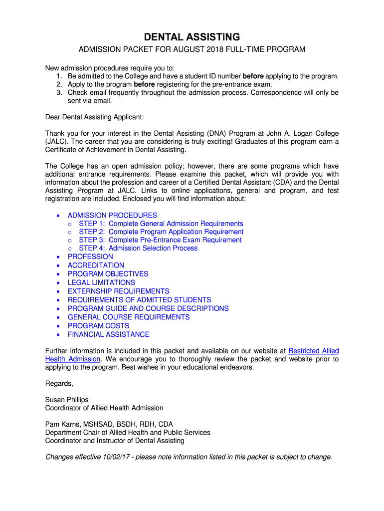 ADMISSION PACKET FOR AUGUST 2018 FULL TIME PROGRAM