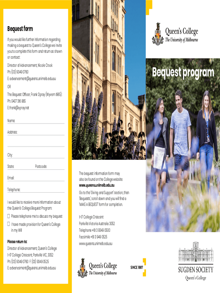 Bequest form If you would like further information regarding making a bequest to Queens College we invite you to complete this form and return as shown or contact:Of our 100+ students who enter our