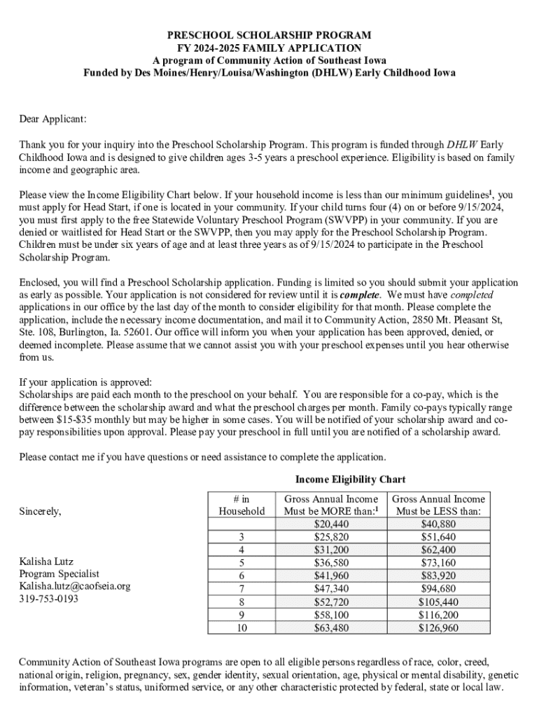 PRESCHOOL SCHOLARSHIP PROGRAM FY 20242025 FAMILY APPLICATION A program of Community Action of Southeast Iowa Funded by Des Moines/Henry/Louisa/Washington (DHLW) Early Childhood IowaDear Applicant: