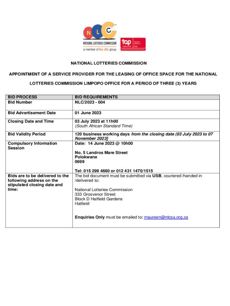 NATIONAL LOTTERIES COMMISSION APPOINTMENT OF A SERVICE PROVIDER FOR THE LEASING OF OFFICE SPACE FOR THE NATIONAL LOTTERIES COMMISSION LIMPOPO OFFICE FOR A PERIOD OF THREE (3) YEARS BID PROCESS Bid