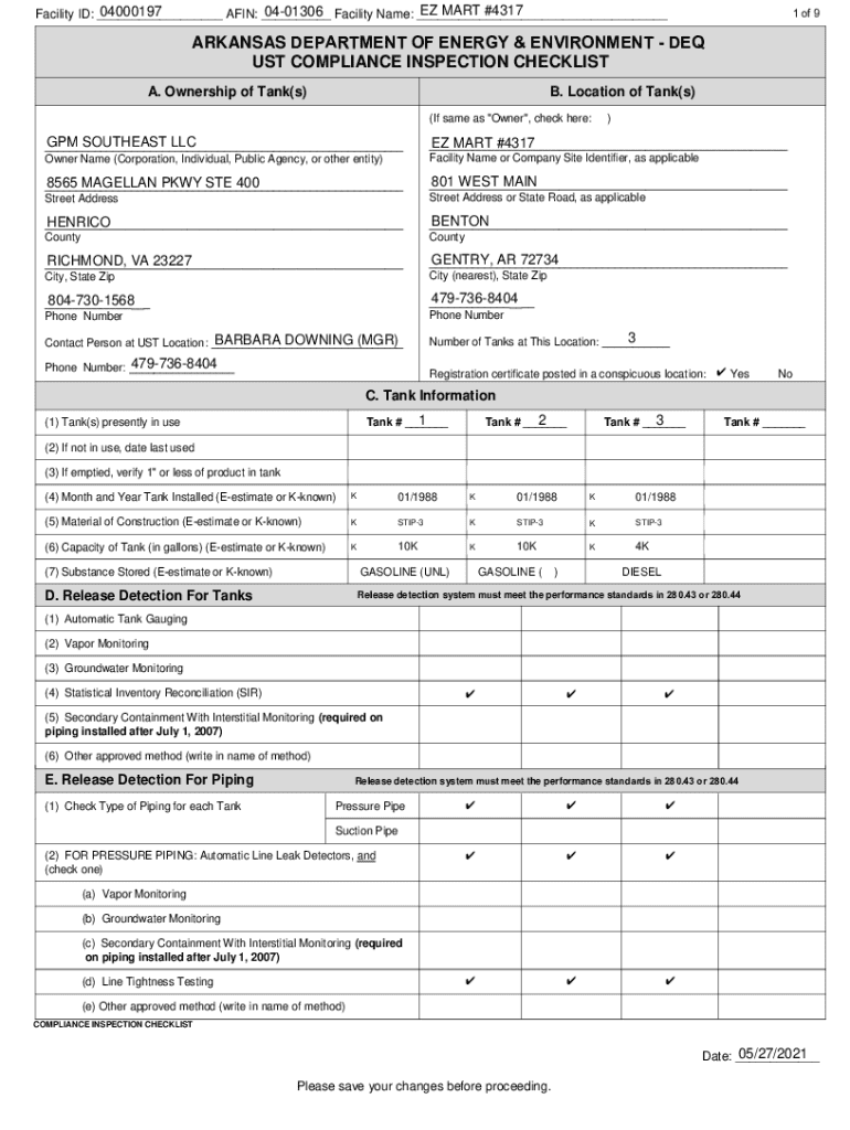 1 of 9EZ MART #4317 0401306 Facility Names: ___ 04000197 Facility ID: ___ AKIN: ___ARKANSAS DEPARTMENT OF ENERGY & ENVIRONMENT DEQ MUST COMPLIANCE INSPECTION CHECKLIST A. Ownership of Tank(s)B. Location