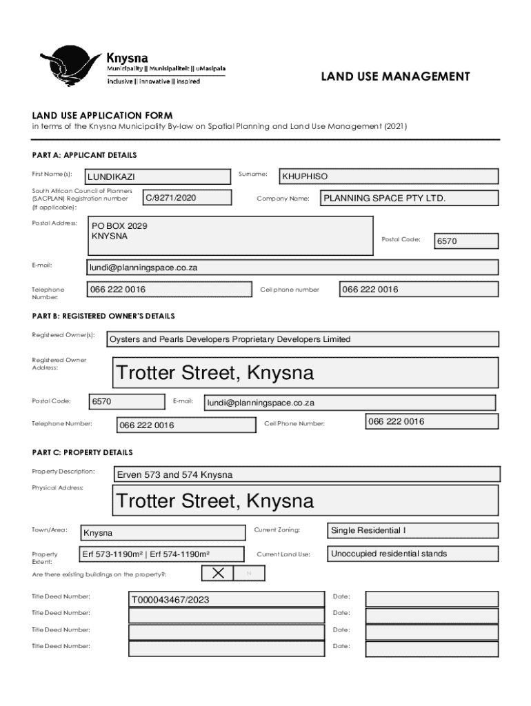 LAND USE MANAGEMENT LAND USE APPLICATION FORM in terms of the Kṛṣṇa Municipality Bylaw on Spatial Planning and Land Use Management (2021)PART A: APPLICANT DETAILS First Name(s):Surname:LUNDIKAZISouth