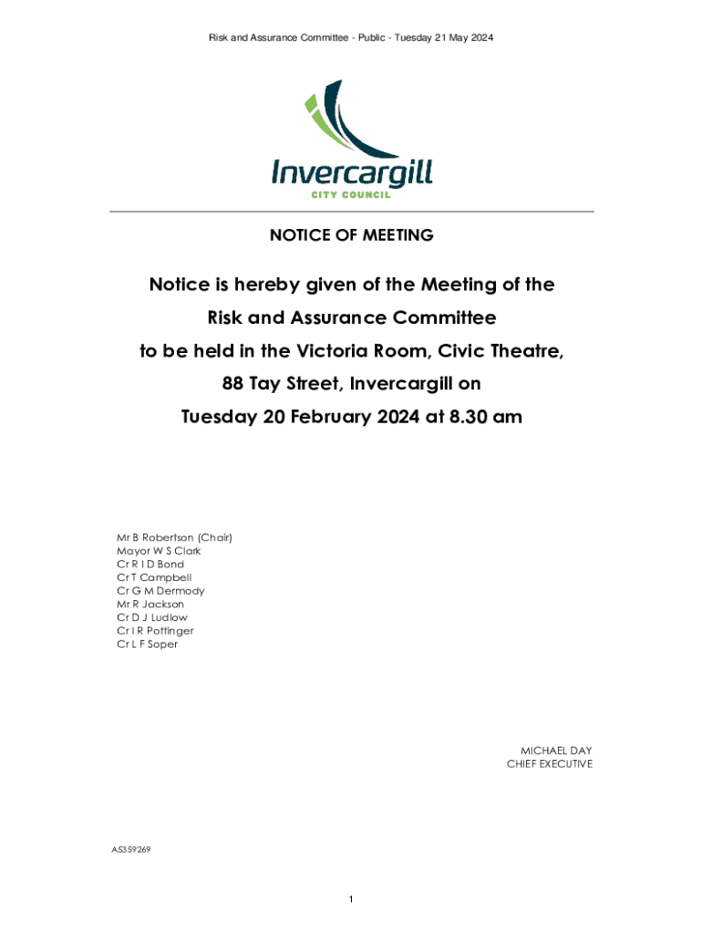 Risk and Assurance Committee Public Tuesday 21 May 2024NOTICE OF MEETINGNotice is hereby given of the Meeting of the