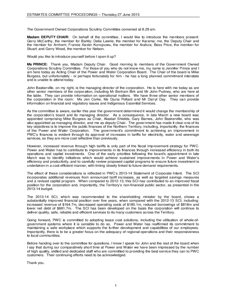 Get the free Estimates & Government Owned Corporations Scrutiny ... - parliament nt gov