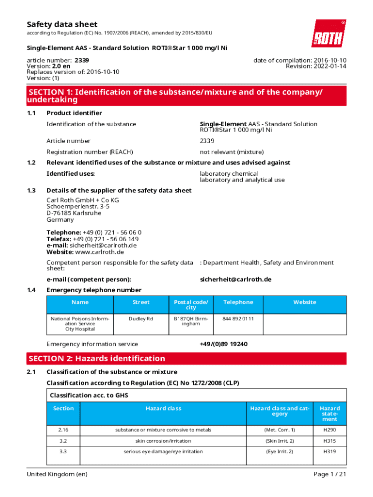 Safety data sheet according to Regulation (EC) No. 1907/2006 (REACH), amended by 2015/830/EUSingleElement AAS Standard Solution ROTIStar 1 000 mg/l Ni article number: 2339 Version: 2.0 en Replaces