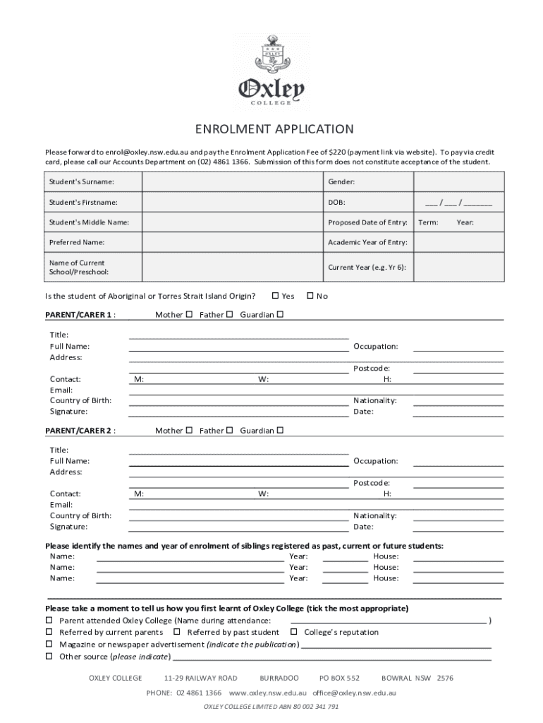 ENROLMENT APPLICATION Please forward to enrol@oxley.nsw.edu.au and pay the Enrolment Application Fee of $220 (payment link via website). To pay via credit card, please call our Accounts Department