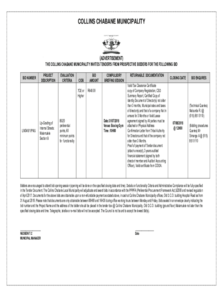 THE COLLINS CHARADE MUNICIPALITY INVITES TENDER\'S FROM PROSPECTIVE BIDDERS FOR THE FOLLOWING BID