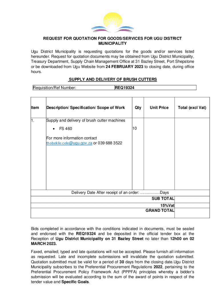 Ugu District Municipality is requesting quotations for the supply and delivery of brush cutter machines. The document provides information on how to obtain the request for quotation documents and the deadline for submission of bids. It also outlines the evaluation criteria, including the 80/20 preferential point system for price and specific goals. The document emphasizes the importance of compliance with tax obligations and provides instructions on how to submit a valid bid. Failure to...
