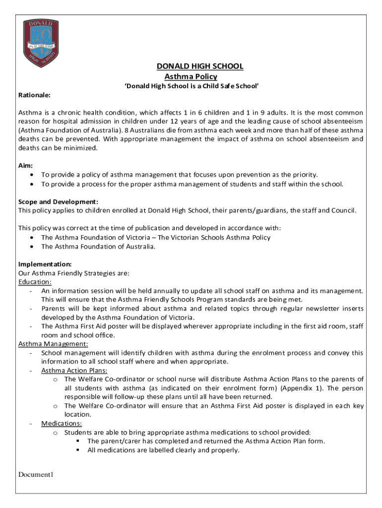 DONALD HIGH SCHOOL Asthma Policy Donald High School is a Child Safe School Rationale: Asthma is a chronic health condition, which affects 1 in 6 children and 1 in 9 adults. It is the most common reason