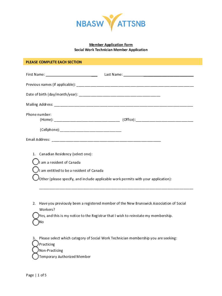 Member Application Form Social Work Technician Member Application PLEASE COMPLETE EACH SECTION First Name:___Last Name:___ ___Previous names (if applicable): ___ Date of birth (day/month/year): ___