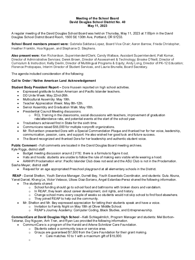 Meeting of the School Board David Douglas School District No. 40 May 11, 2023 A regular meeting of the David Douglas School Board was held on Thursday, May 11, 2023 at 7:00pm in the David Douglas