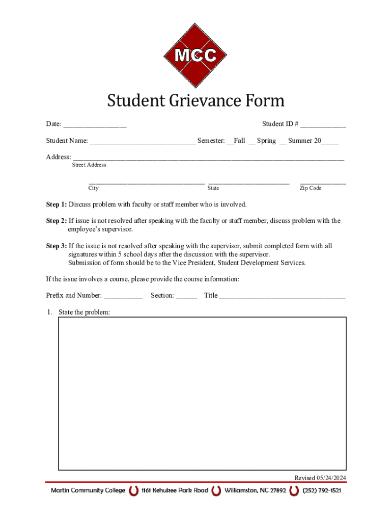 Student Grievance Form Date: ___Student ID # ___Student Name: ___ Semester: __Fall __ Spring __ Summer 20___ Address: ___ Street Address___ ______City CodeStateStep 1: Discuss problem with faculty